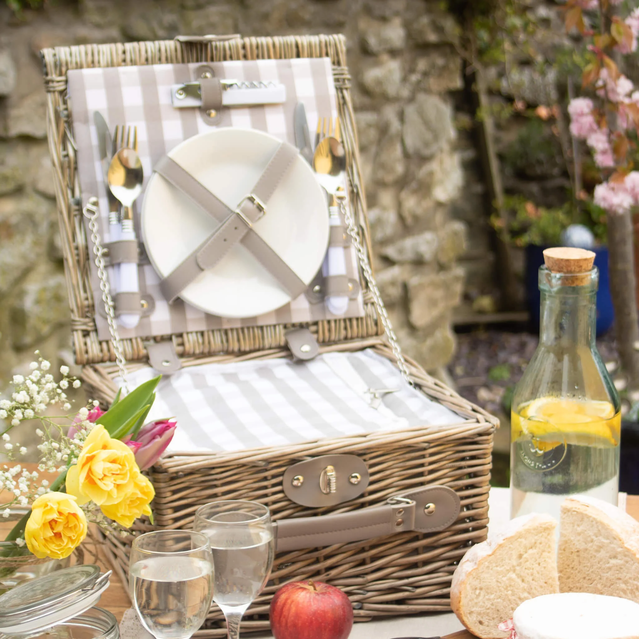 This full antique wash, grey and white checked hamper is an essential for food lovers. Handmade from lightly steamed willow, with matching faux grey leather handles and straps, the lid securely holds white handled cutlery and ceramic plates.