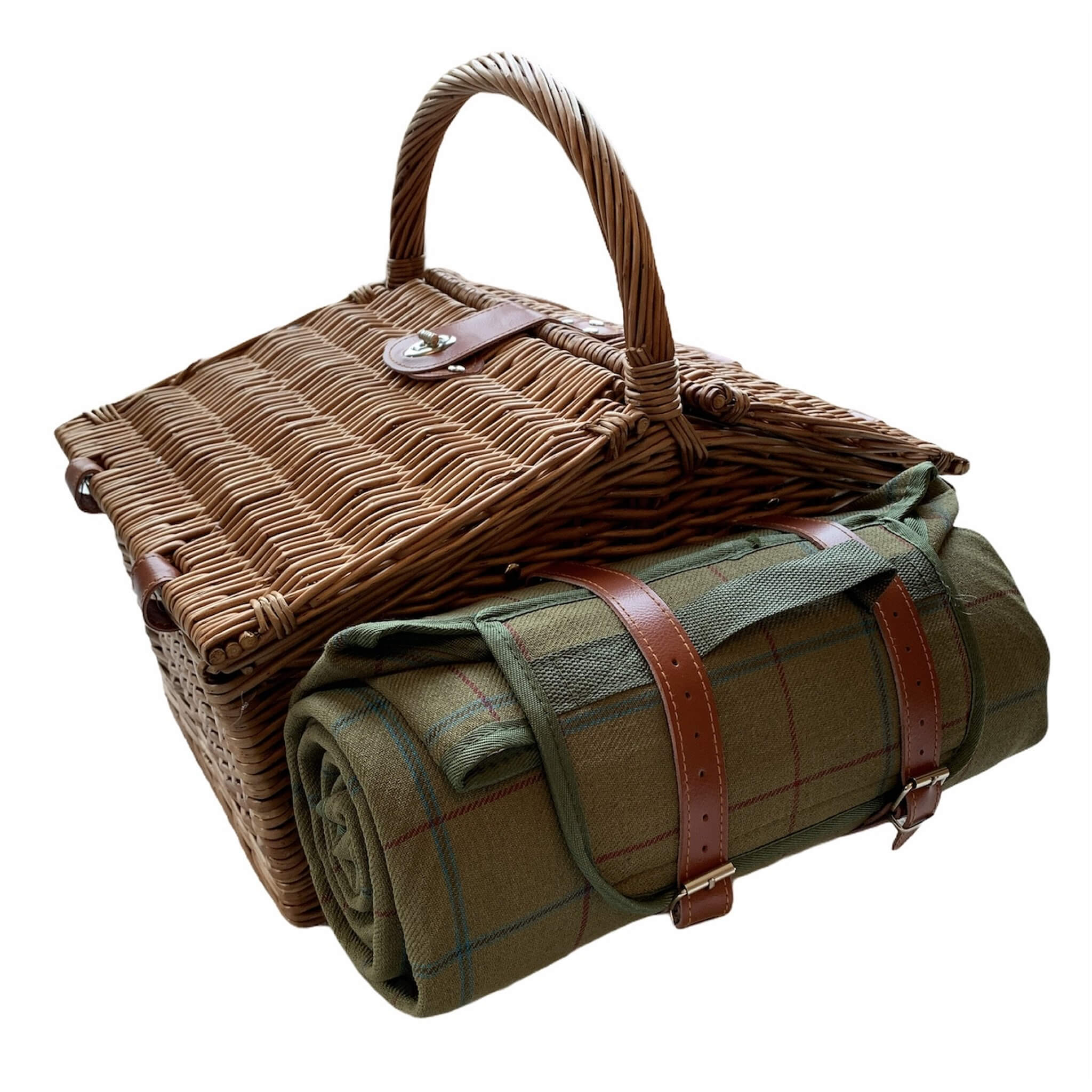 This highlands inspired hamper also comes with a green tweed picnic blanket that has a protective backing, which cleverly straps to the outside of the hamper, making it easy to carry and helping create the perfect ambience wherever you go.