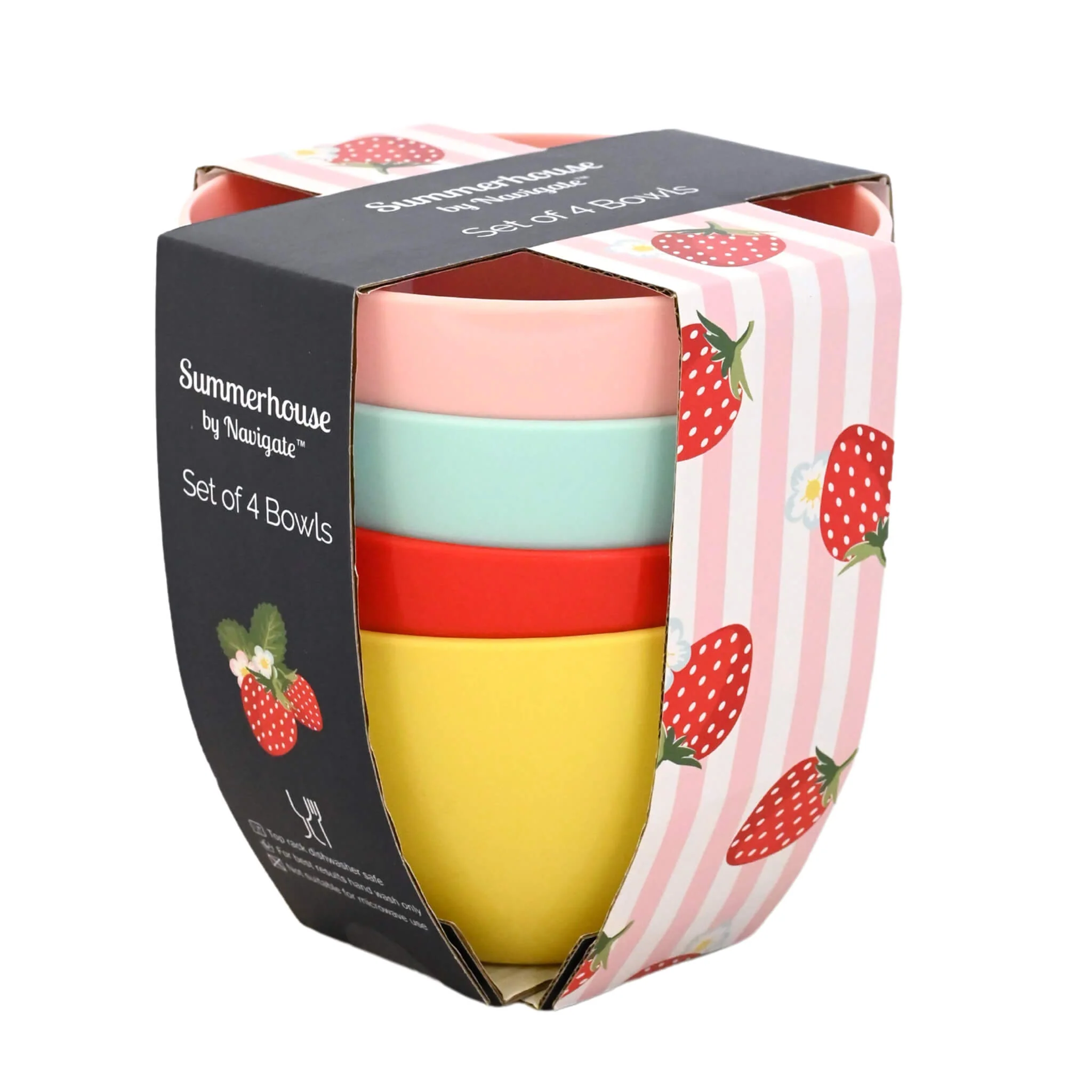 Enhance your alfresco dining experience with our Strawberries & Cream Bowls. Perfect for picnics and beach barbeques, this set of four bowls comes in coordinating colours of blue, yellow, pink, and red. Take them with you on the go and enjoy a touch of summertime wherever you are.
